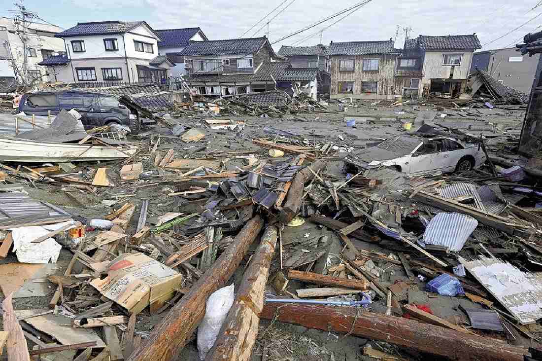 Houses and cars damaged by the tsunami and earthquake in Suzu, Ishikawa Prefecture, Tuesday morning.