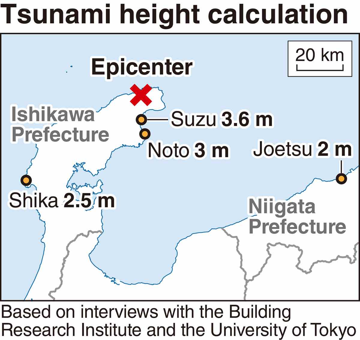 A research team from the Building Research Institute and the University of Tokyo used data on faults provided by the Geospatial Information Authority of Japan to calculate the height of tsunamis in various locations using computers. They found that the maximum tsunami height was estimated at 3.6 meters in Suzu, where damage was severe and about 3 meters in the town of Noto. Calculations also suggested tsunami heights of about 2 meters for Hegura Island in Wajima, 2.5 meters in Shika, and 2 meters in Joetsu, Niigata Prefecture.