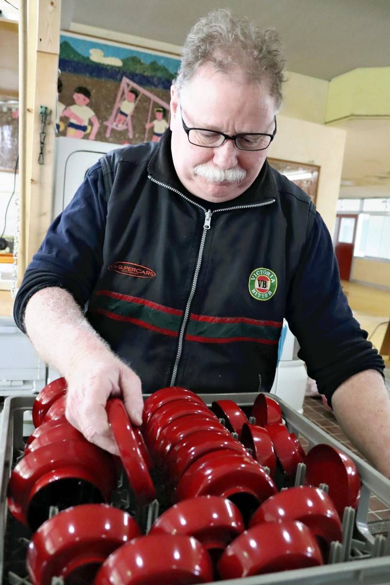 Benjamin Flatt sorts through cleaned Wajima lacquerware items in Noto, Ishikawa Prefecture, in May.