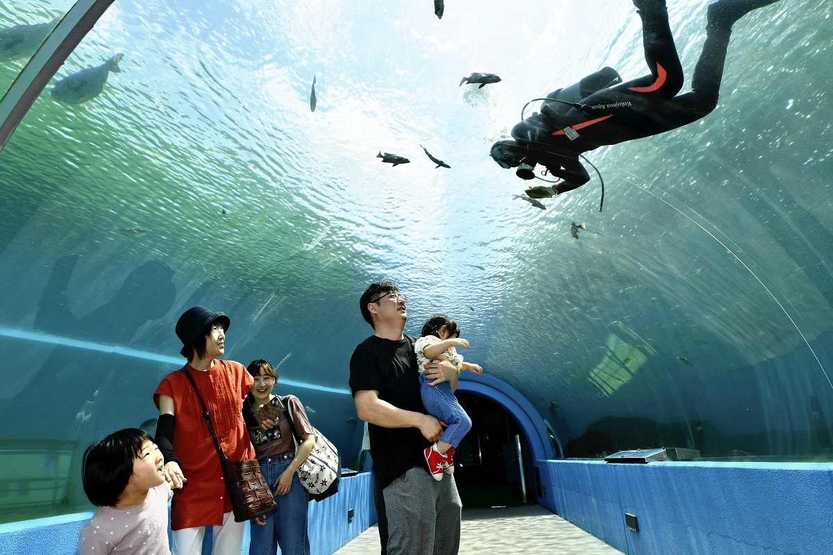 Visitors look up at the aquarium tank at Notojima Aquarium in Nanao, Ishikawa Prefecture, on Saturday.