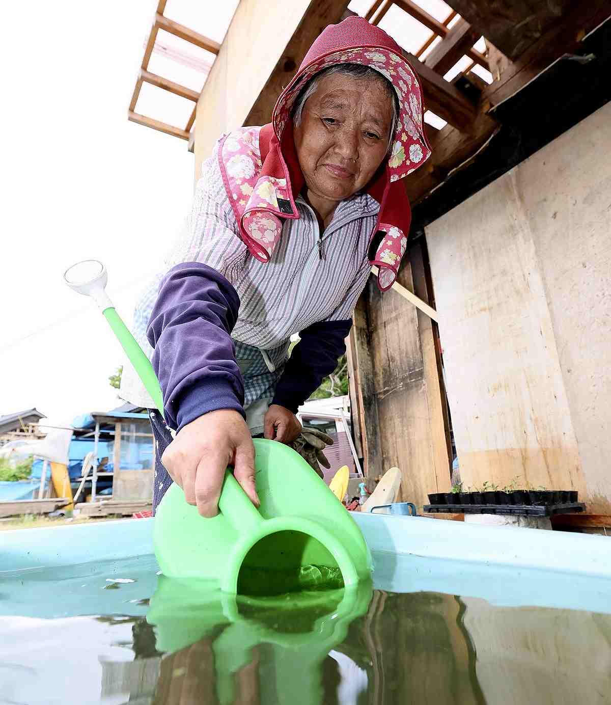 Hideko Yoshida uses rainwater to grow vegetables in her garden in Suzu, Ishikawa Prefecture, on Wednesday.