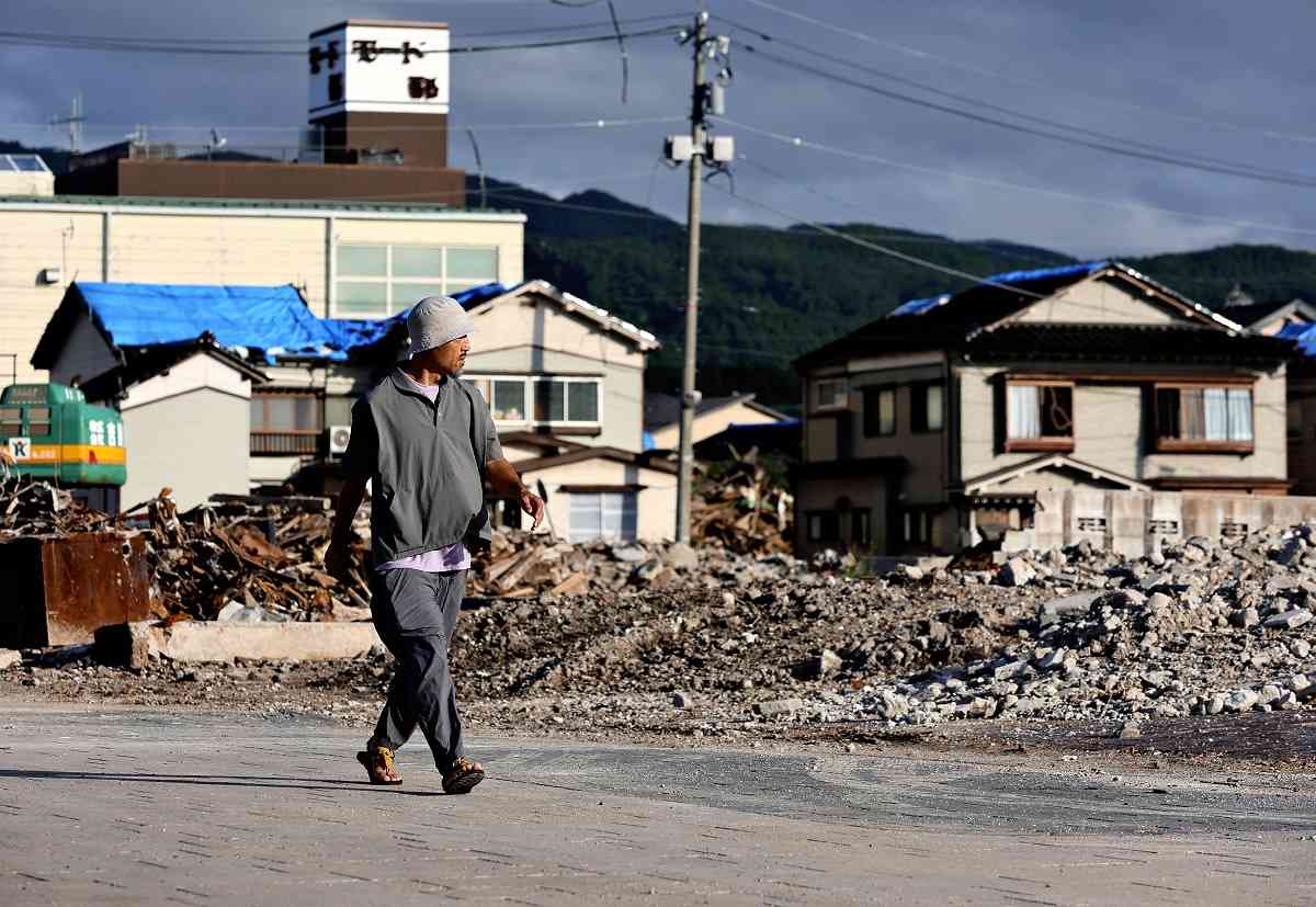 A man walks around an area where the Wajima Morning Market was located in Wajima on Sunday.