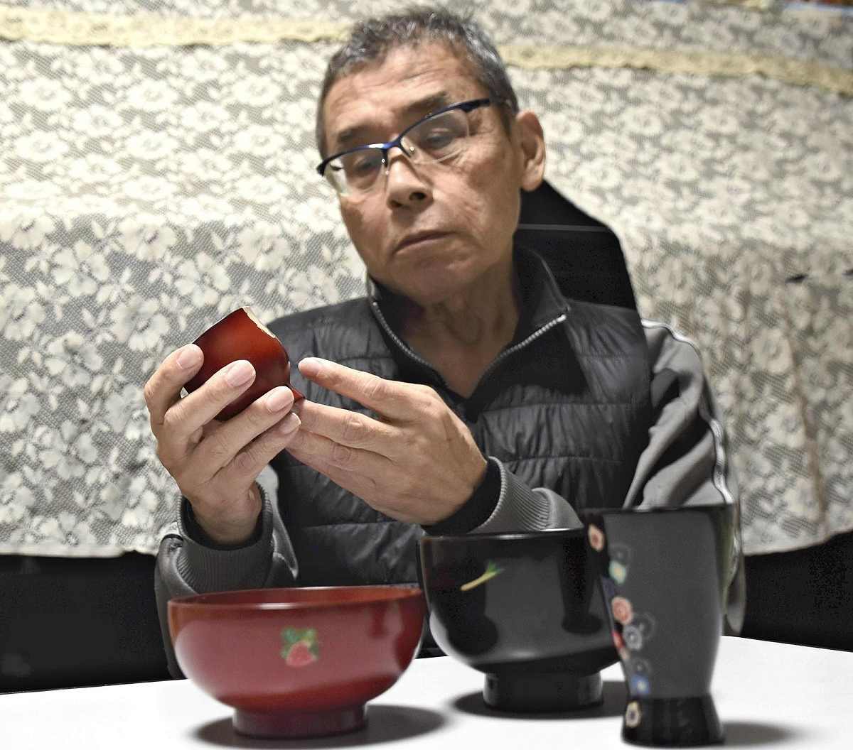 Tomio Shimada holds a sake cup, the last maki-e lacquerware work completed by his daughter Reina, in Sanda, Hyogo Prefecture, on Nov. 23.