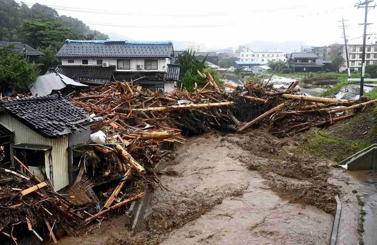 A residential area, covered with piles of rubble and driftwood from heavy rains, is seen in Wajima, Ishikawa Prefecture, on Sept. 22.
