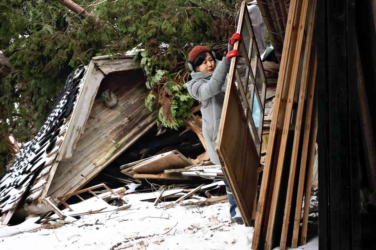 On Dec. 23 in Suzu, Ishikawa Prefecture, five volunteers removed fusuma sliding doors, shoji screens and glass doors that survived the disaster from a 76-year-old house that had been heavily damaged by the quake. The house is scheduled to be demolished with public funds in March.