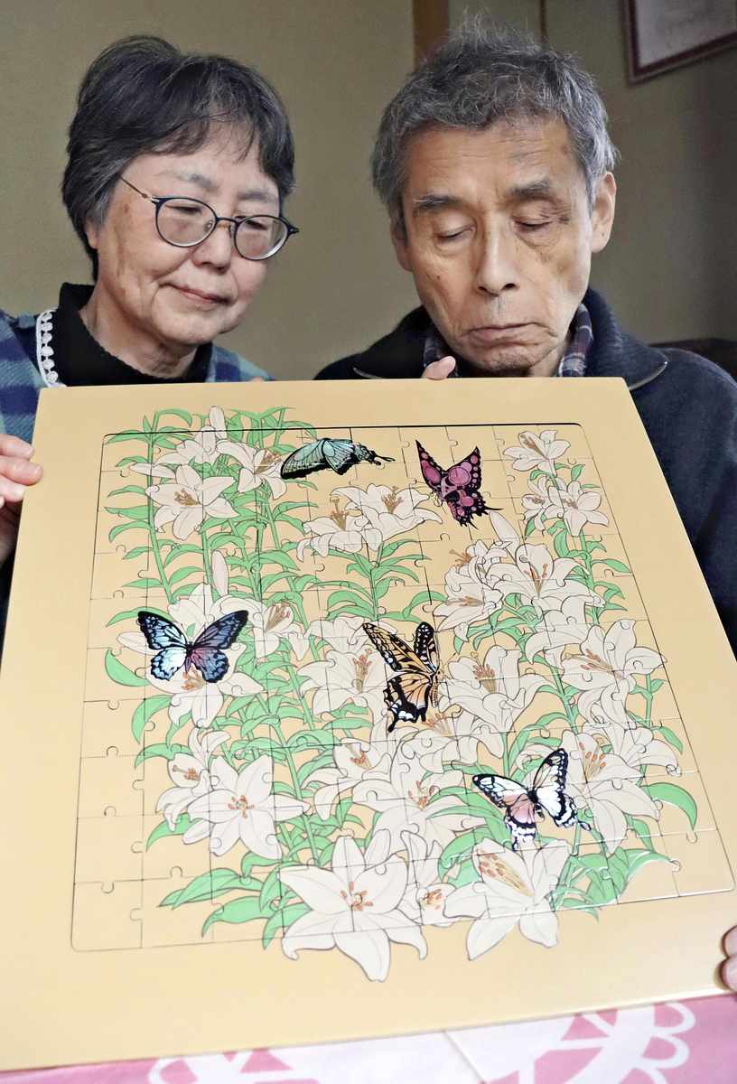 Tomio and Yuko Shimada look at a maki-e jigsaw puzzle, which was made by their daughter Reina, in Sanda, Hyogo Prefecture.