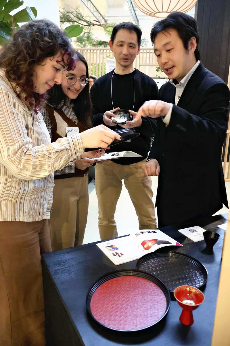 Officials from the Wajima municipal government and the Wajima Urushi Ware Cooperative Society stopped by venues displaying traditional crafts from Akita and Fukui prefectures. They were also seen explaining the more than 120-step production process for Wajima lacquerware and the techniques for decorating pieces with gold powder, holding up trays and bowls brought from Japan.