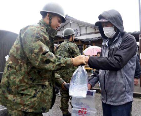 The Ground Self-Defense Force provided water to residents in Shika, Ishikawa Prefecture, on Wednesda...