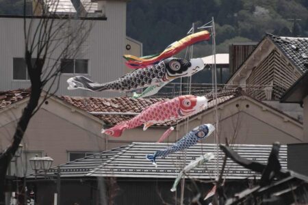 WAJIMA, Ishikawa — Koinobori carp streamers are fluttering in the wind above the Wajima Morning M...
