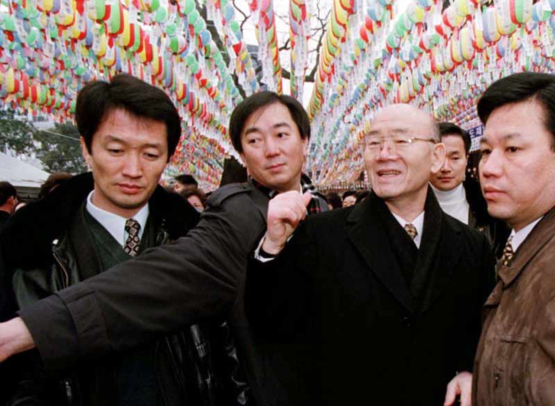 Former South Korean president Chun Doo-hwan, surrounded by bodyguards, walks under Buddhist prayer lanterns at the Chogye temple in Seoul on December 30, 1997.