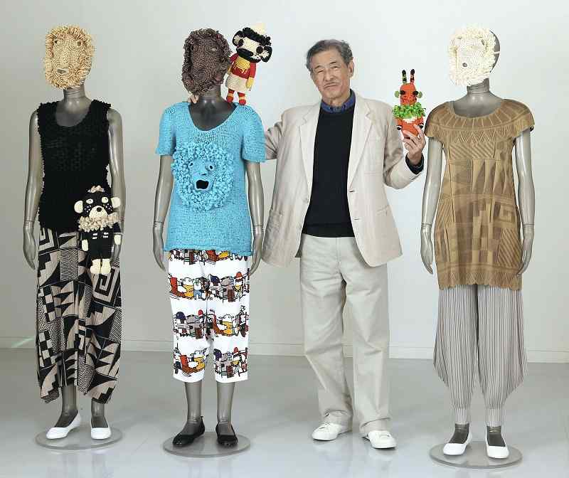 Issey Miyake poses with pieces from his collection at the Tokyo Midtown commercial complex in Minato Ward, Tokyo, in November 2010.