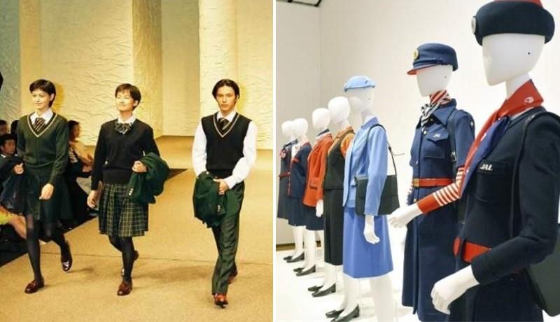 Right : Uniforms for Japan Airlines flight attendants, the first three from the right, designed by Hanae Mori are seen at a museum in Masuda, Shimane Prefecture, in April 2015.