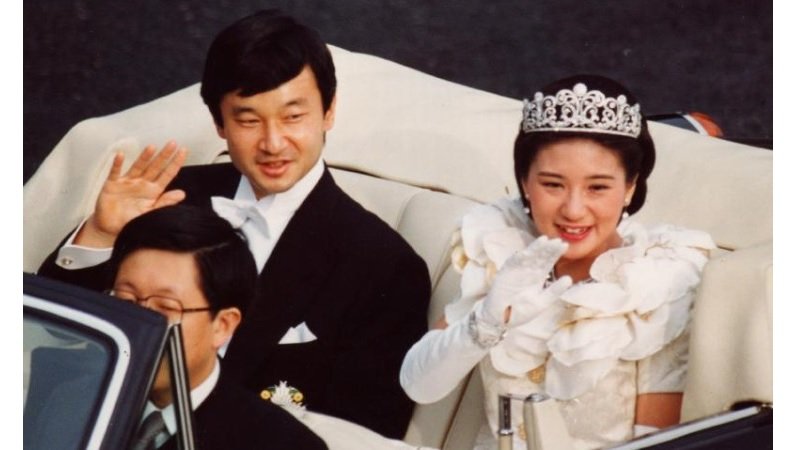 The Emperor and Empress, then crown prince and princess, wave during a parade after their wedding in June 1993. The white dress was designed by Hanae Mori.