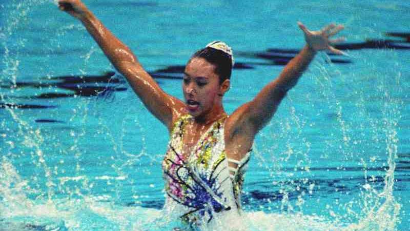 Mikako Kotani competes in a synchronized swimming event wearing a Mori-designed swimsuit at the Seoul Olympic Games in 1988.