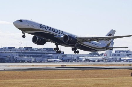 An aircraft of Taiwan’s Starlux Airlines roared off for Taipei from the runway at Kumamoto Airpor...