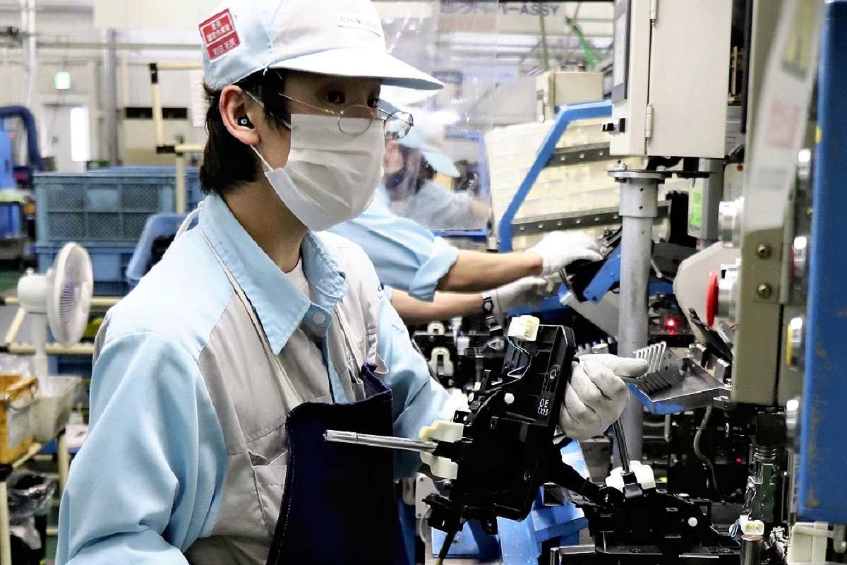 An employee of Chiyoda Industries Co. in Ota, Gunma Prefecture, produces shift levers on Oct. 23. The parts will become unnecessary once electric vehicles become more common.