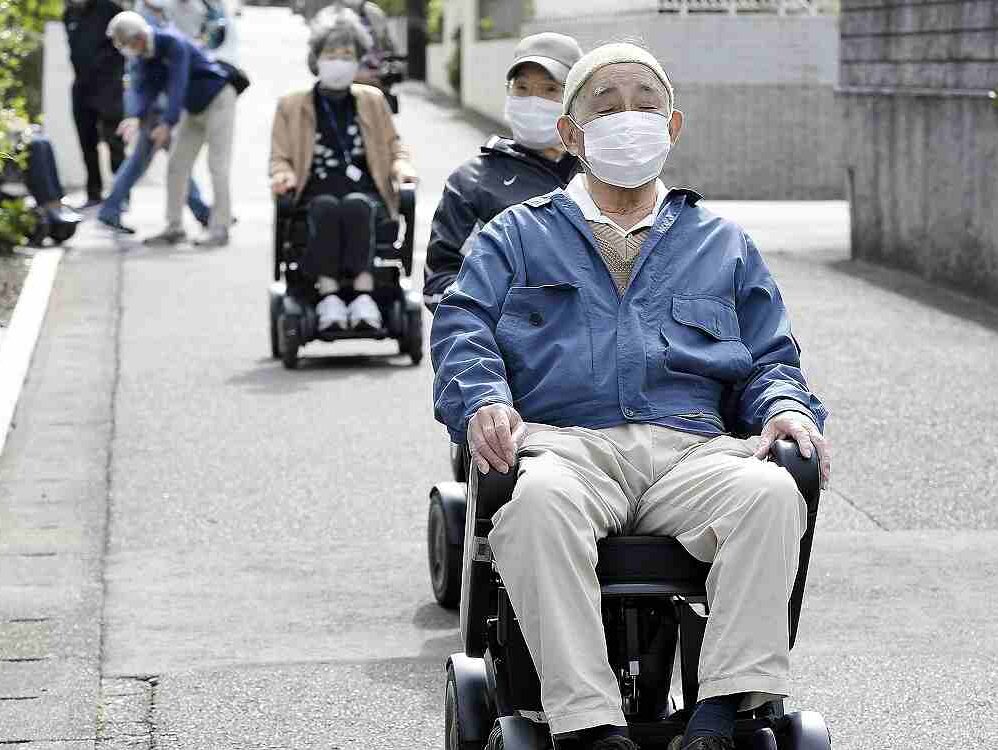 Electric wheelchairs are used in a transportation experiment conducted by the Kamigo Neopolis district in Sakae Ward, Yokohama, on Oct. 30.