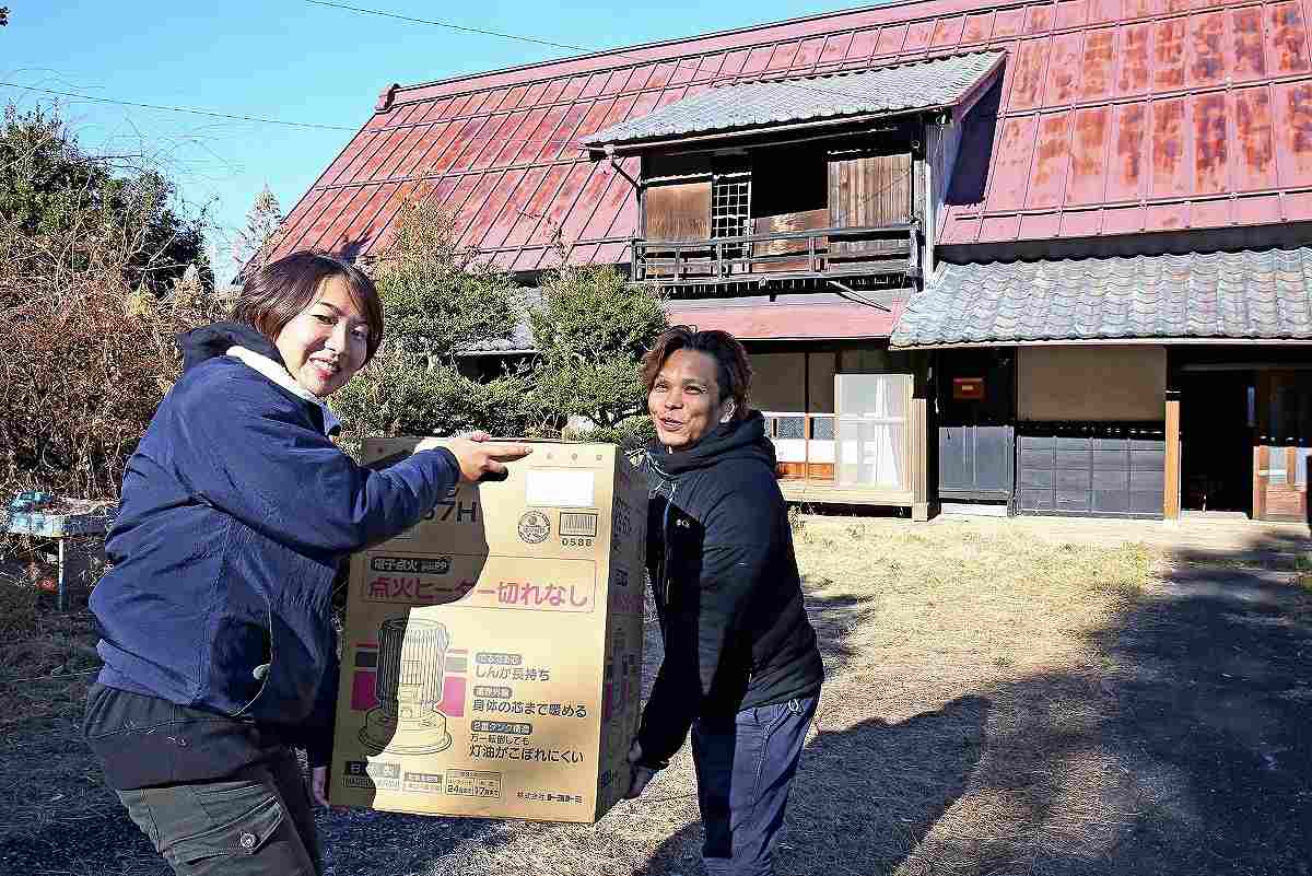 Kanako Takahashi, left, and her husband Yuki carry an oil stove to their new home in Fuefuki, Yamanashi Prefecture.
