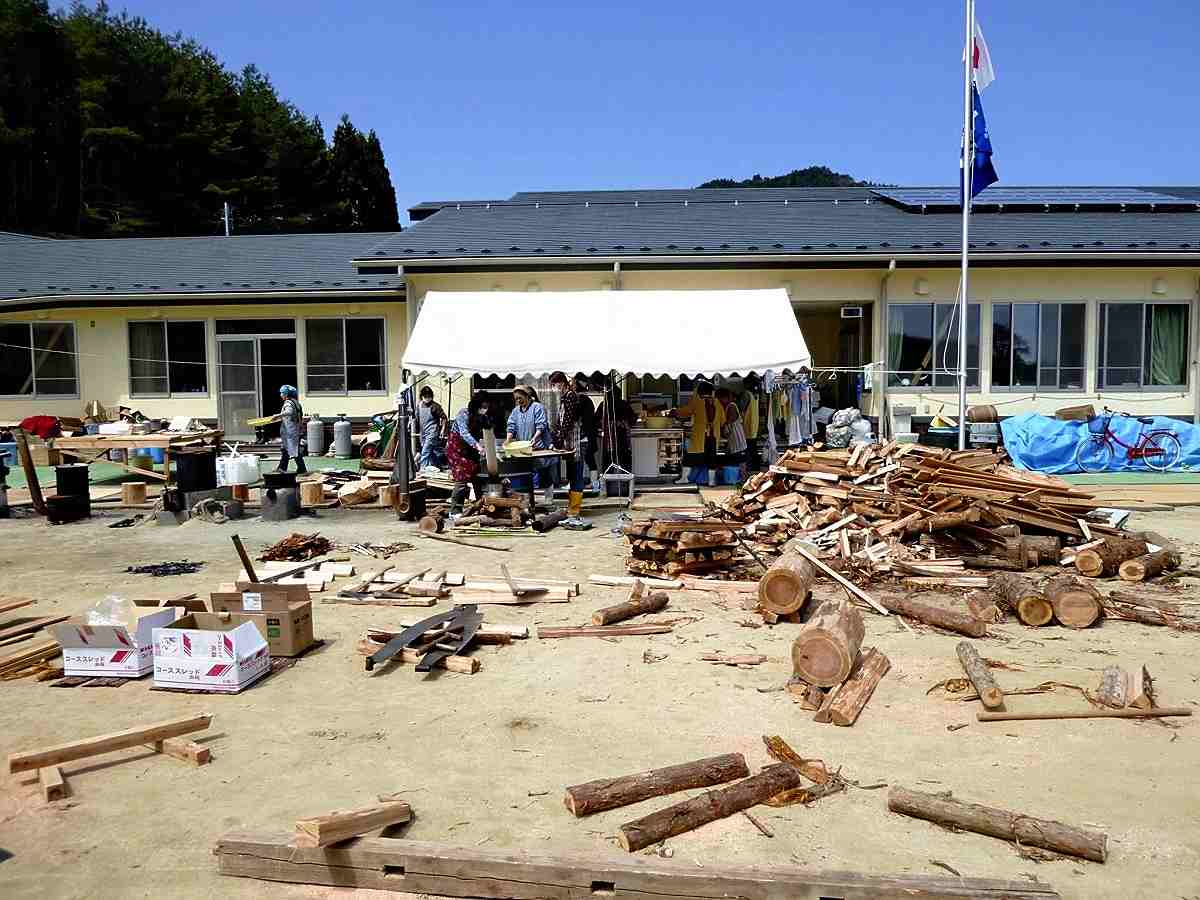 Wooden debris to be used as fuel is seen on the grounds of an evacuation shelter on April 18, 2011.