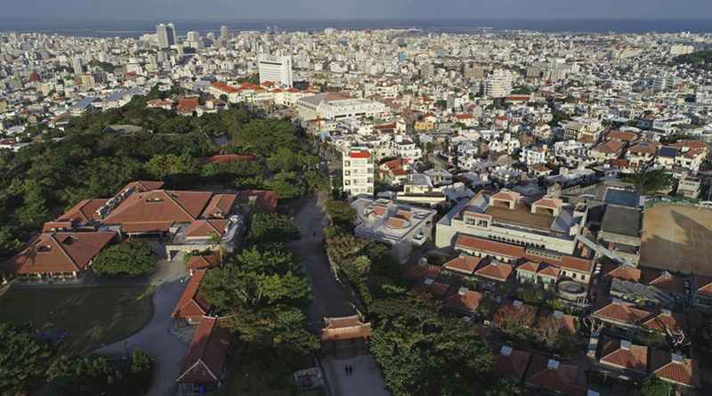 The large buildings to the left were the campus of the University of the Ryukyus, which was established by the United States on the site of the castle.