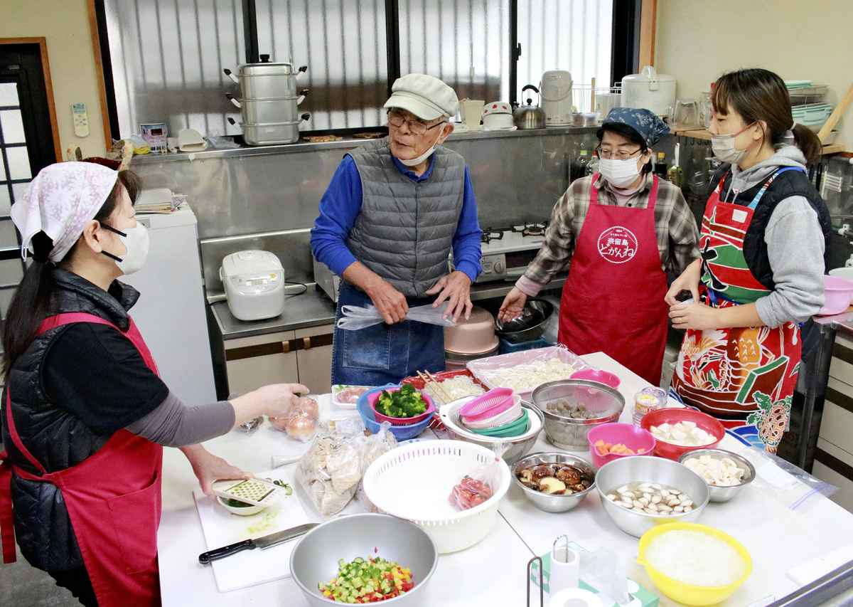 On Naru Island in Goto City, Nagasaki Prefecture, about 90 kilometers west of Nagasaki City, six islanders were in the middle of preparing a meal using local fish at a cafeteria in “Machikyo Moyaiba Narushima Doganne” community exchange center in mid-January.