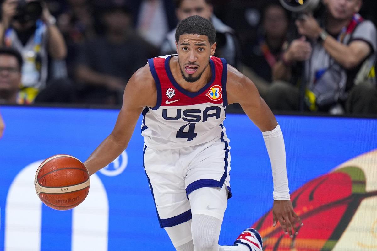 U.S. guard Tyrese Haliburton (4) brings the ball up court against New Zealand during the second half of a Basketball World Cup group C match in Manila, Saturday, Aug. 26, 2023. The United States defeated New Zealand 99-72.