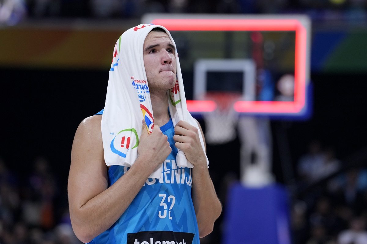 Slovenia’s Bine Prepelic reacts after losing to Canada in a Basketball World Cup quarterfinal game in Manila, Philippines, Wednesday, Sept. 6, 2023.