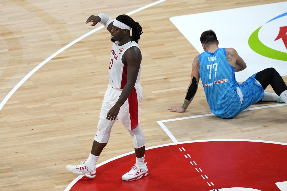 Canada’s Luguentz Dort (0) celebrates as Slovenia’s Luka Doncic sits on the court during the second half of a Basketball World Cup quarterfinal game in Manila, Philippines, Wednesday, Sept. 6, 2023.