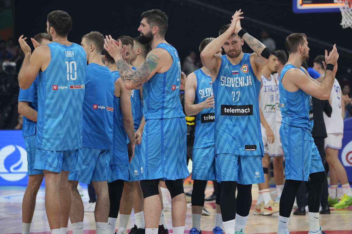 Slovenia guard Luka Doncic (77) and teammates clap after winning against Italy during the Basketball World Cup classification match in Manila, Philippines, Saturday, Sept. 9, 2023.