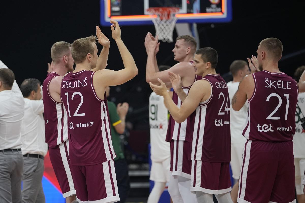 Latvia team celebrates after winning against Lithuania during the Basketball World Cup classification match in Manila, Philippines, Saturday, Sept. 9, 2023.