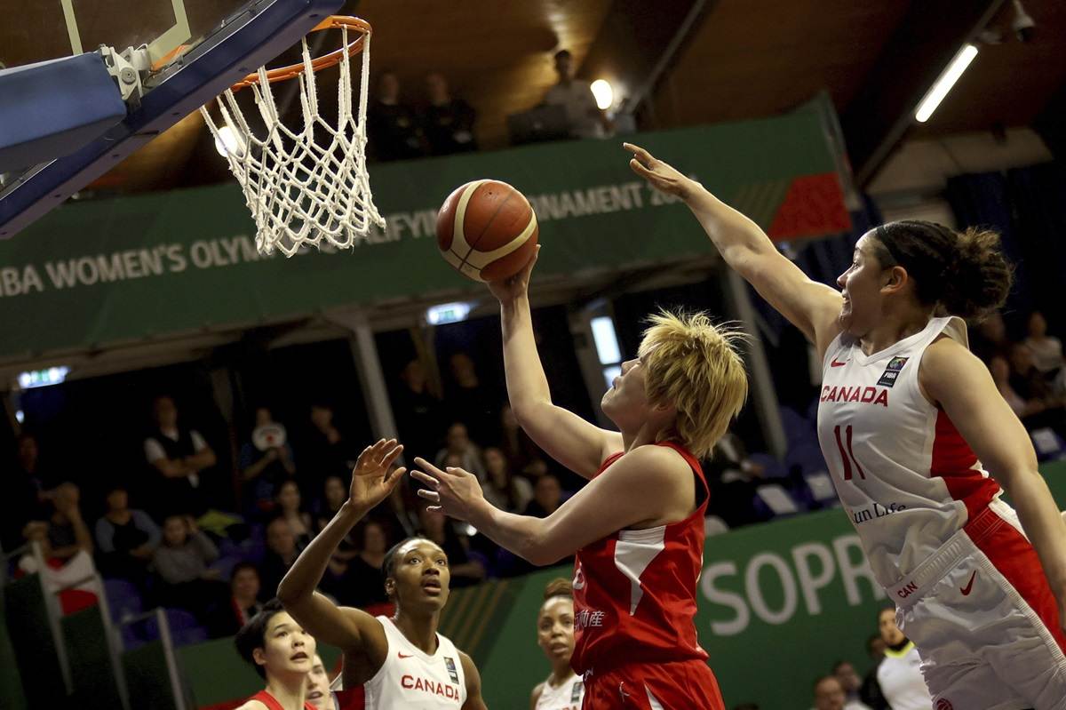 Kayla Alexander, left, and Natalie Achonwa of Canada attempt to block Maki Takada of Japan during a women’s basketball Olympic qualifying tournament third round match in Sopron, Hungary, on Sunday.