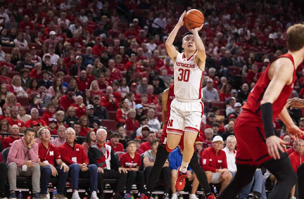 Nebraska’s Keisei Tominaga (30) shoots against Rutgers during the first half of an NCAA college basketball game Sunday, March 3, 2024, in Lincoln, Neb.