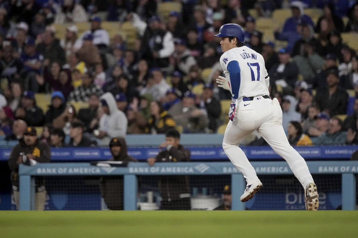Los Angeles Dodgers designated hitter Shohei Ohtani (17) runs to first after hitting a single during the eighth inning of a baseball game against the San Diego Padres Sunday, April 14, 2024, in Los Angeles.