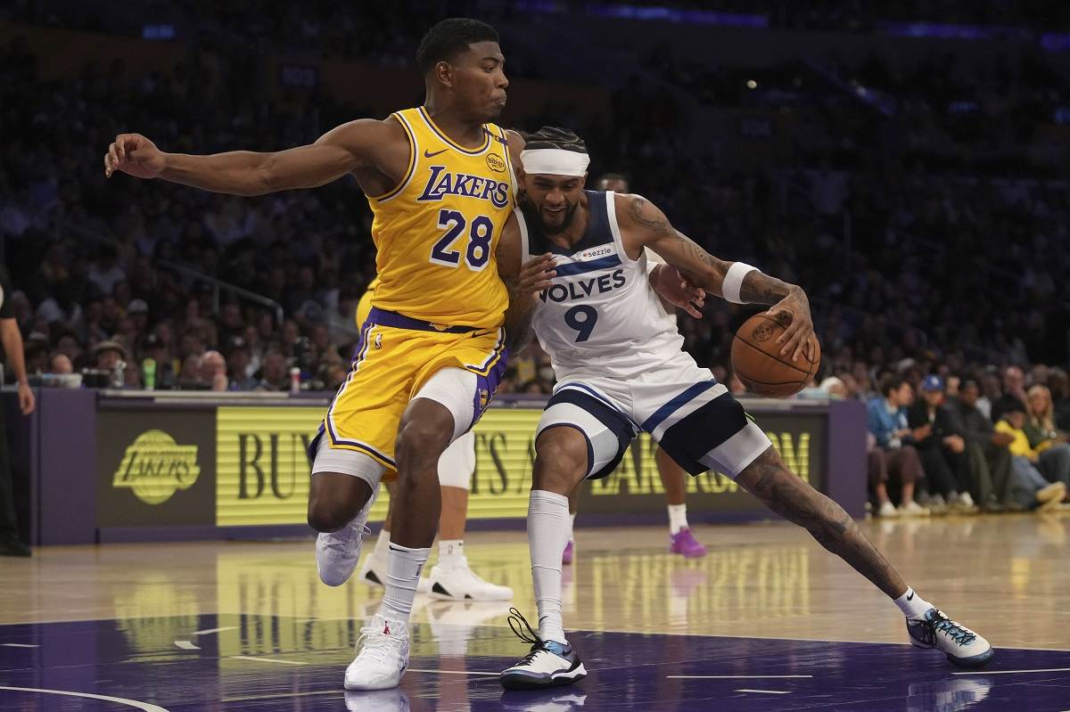 Minnesota Timberwolves guard Nickeil Alexander-Walker (9) works toward the basket as Los Angeles Lakers forward Rui Hachimura (28) defends during the first half of an NBA basketball game, Tuesday, Oct. 22, 2024, in Los Angeles.