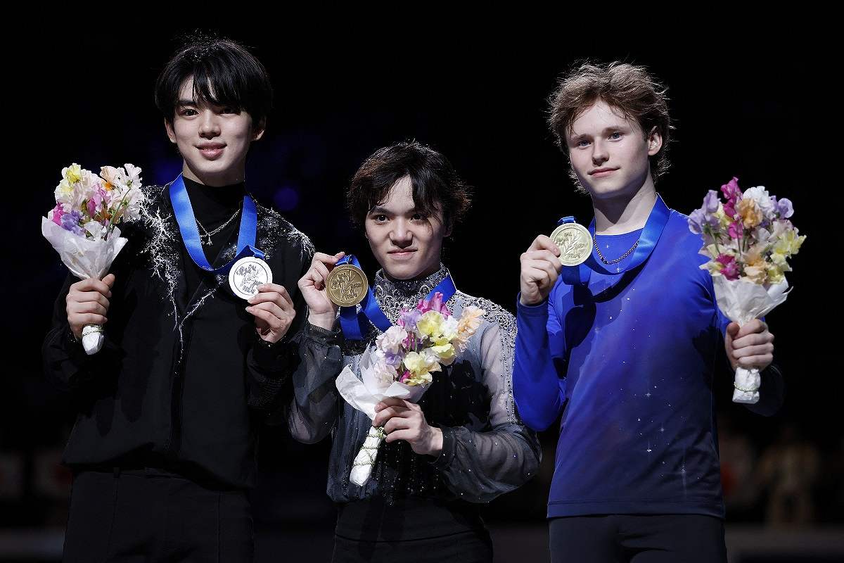 Gold medallist Shoma Uno, center, poses with medal after winning the men’s free skating alongside silver medallist Junhwan Cha of South Korea and bronze medallist Ilia Malinin of the U.S., at the World Figure Skating Championships in Saitama on Sunday.