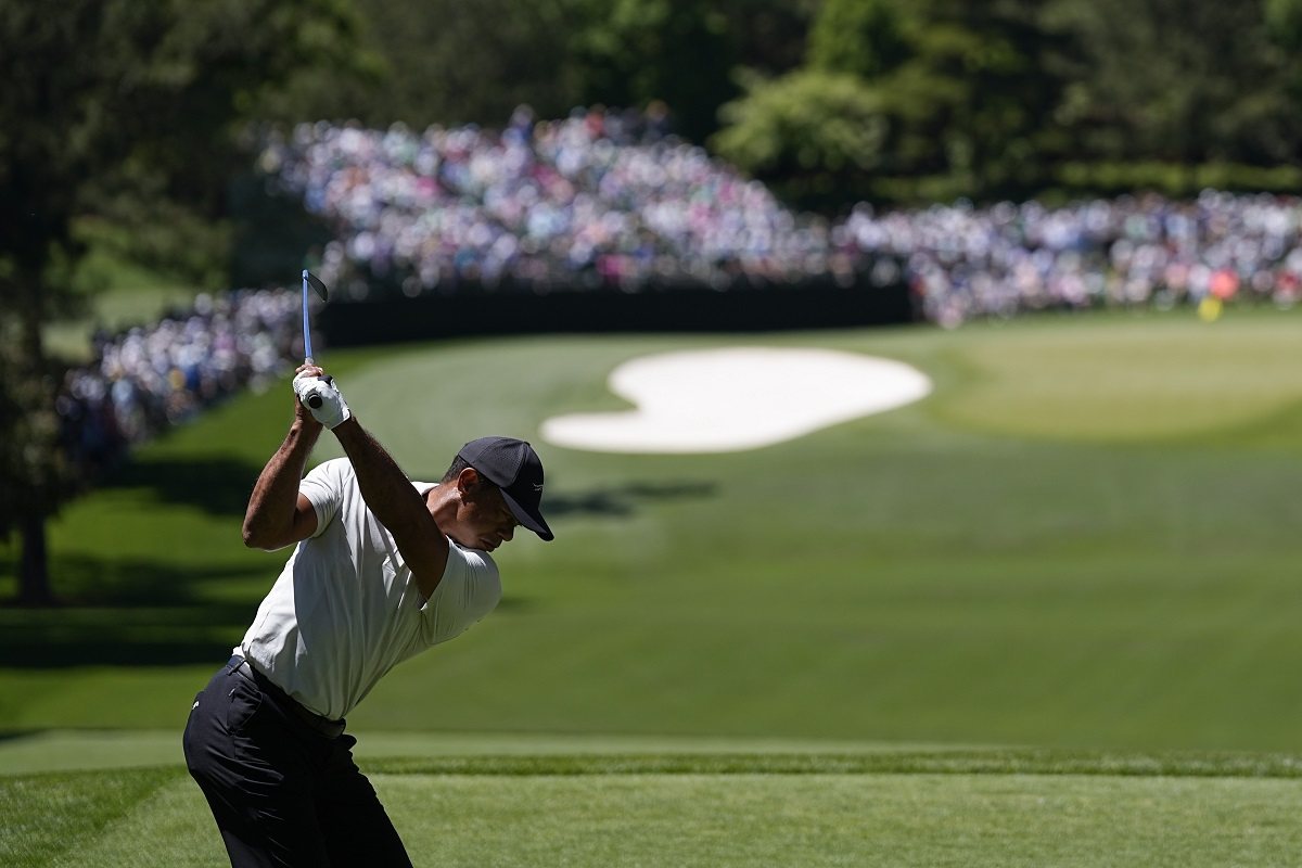Tiger Woods hits his tee shot on the fourth hole during third round at the Masters golf tournament at Augusta National Golf Club Saturday, April 13, 2024, in Augusta, Ga.