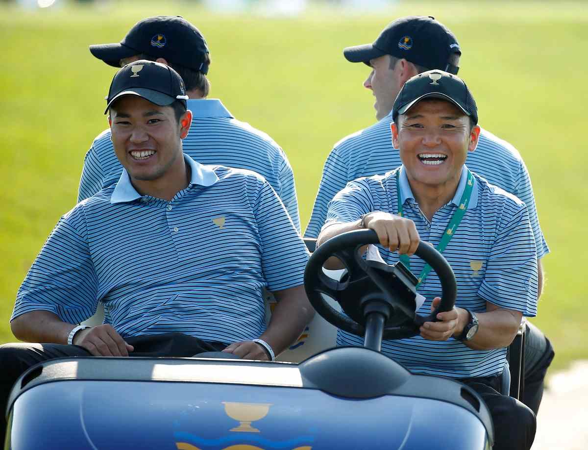International captain’s assistant Shigeki Maruyama, of Japan, drives compatriot Hideki Matsuyama and fellow players in a golf cart during the first practice round for the 2013 Presidents Cup golf tournament at Muirfield Village Golf Club in Dublin, Ohio October 1, 2013.