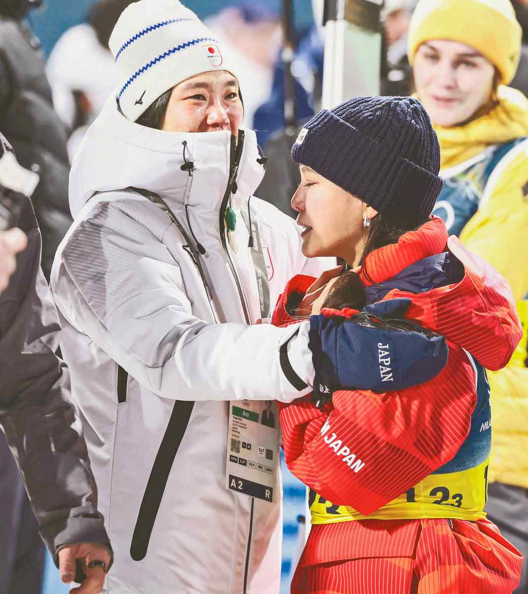 Sara Takanashi, right, sheds tears of joy with Yuki Ito as Japan’s medal in the ski jumping mixed team event is confirmed in Predazzo, Italy, on Tuesday.