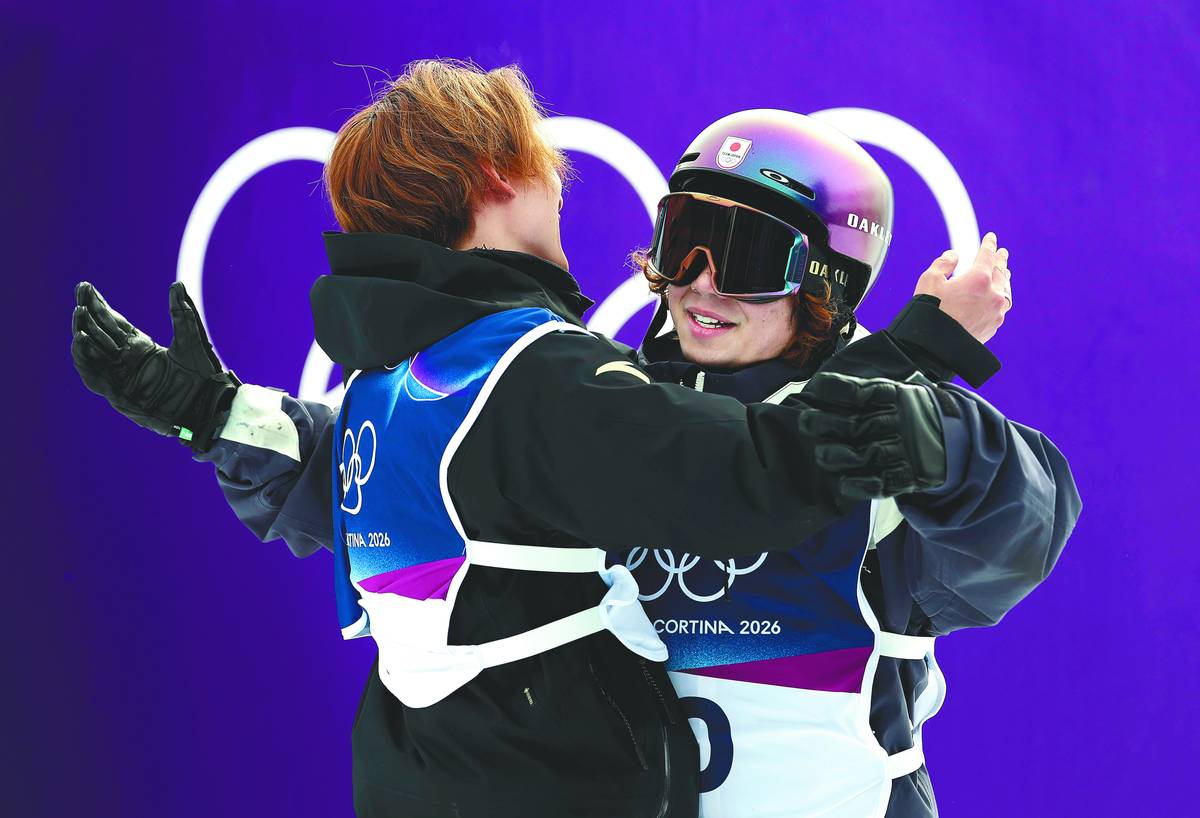 Gold medalist Su Yiming, left, embraces silver medalist Taiga Hasegawa in Livigno, Italy, on Monday.