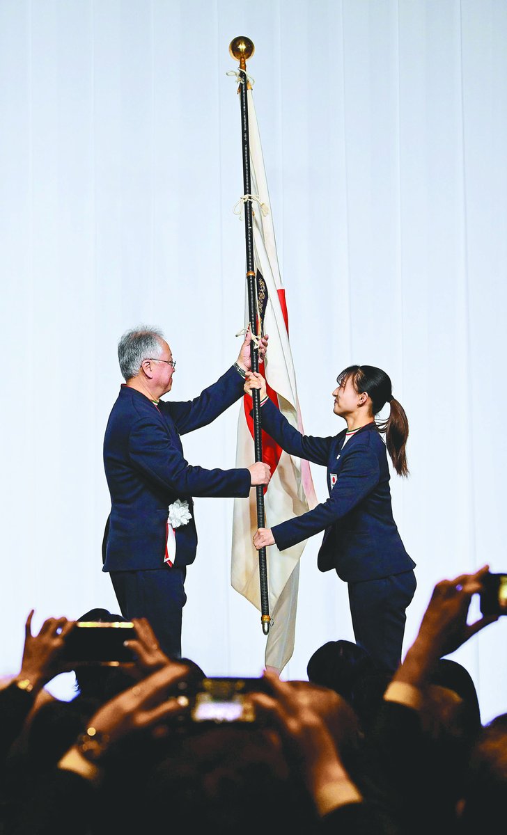 Kaori Sakamoto returns the Team Japan flag to Hidehito Ito during the team’s disbanding ceremony in Tokyo on Wednesday.