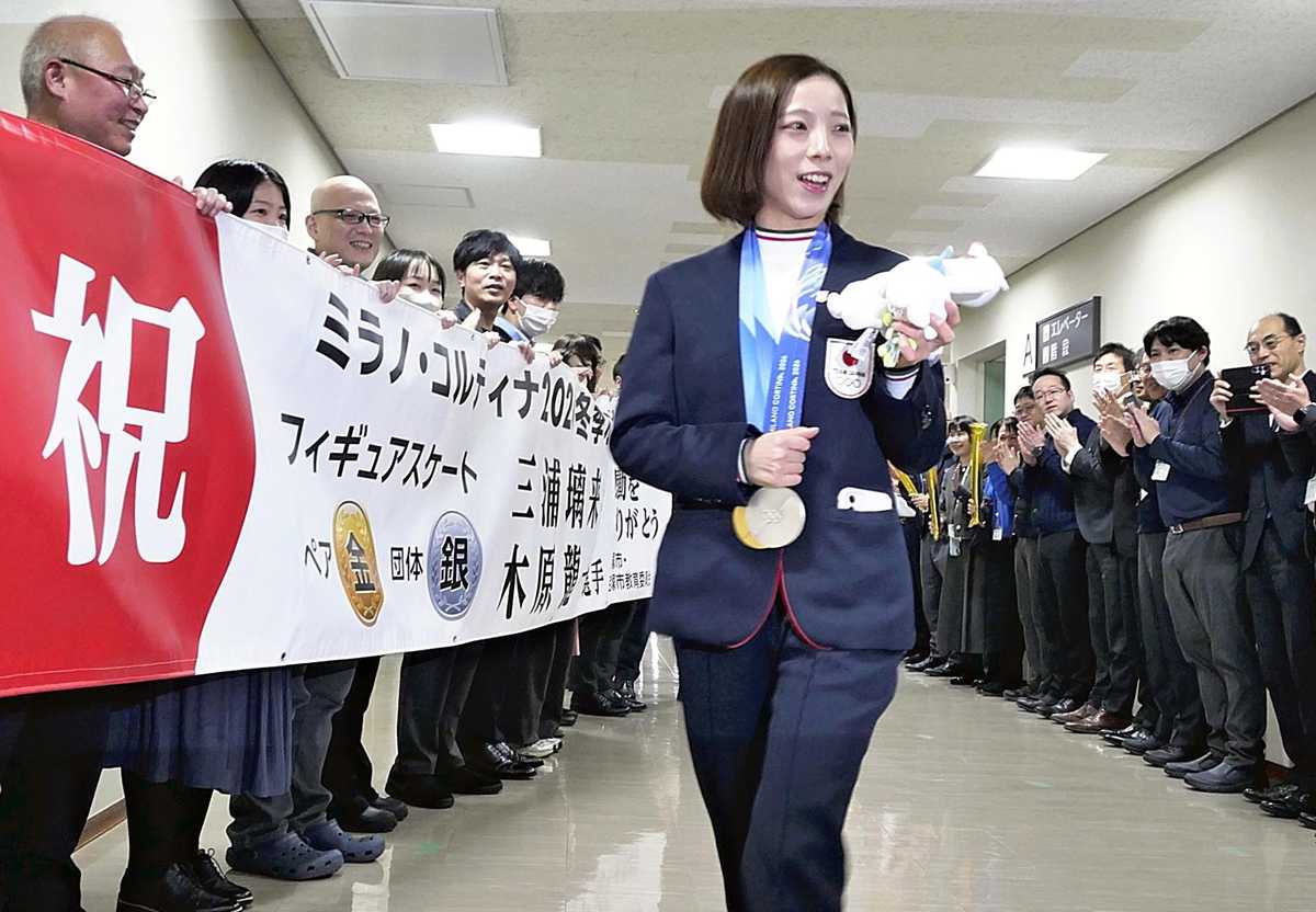 Riku Miura, who won Japan’s first-ever gold medal in pairs figure skating at the Milano Cortina Olympics with partner Ryuichi Kihara, paid a courtesy visit to her hometown city hall in Takarazuka, Hyogo Prefecture, on Monday.
