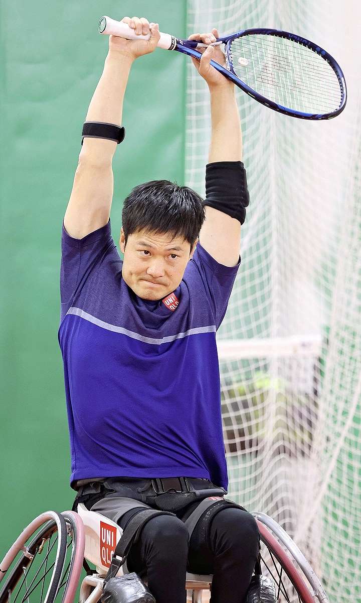 Shingo Kunieda, who boasts 24 Grand Slam singles titles in wheelchair tennis, holds up a tennis racket in Koto Ward, Tokyo, on Dec. 12.