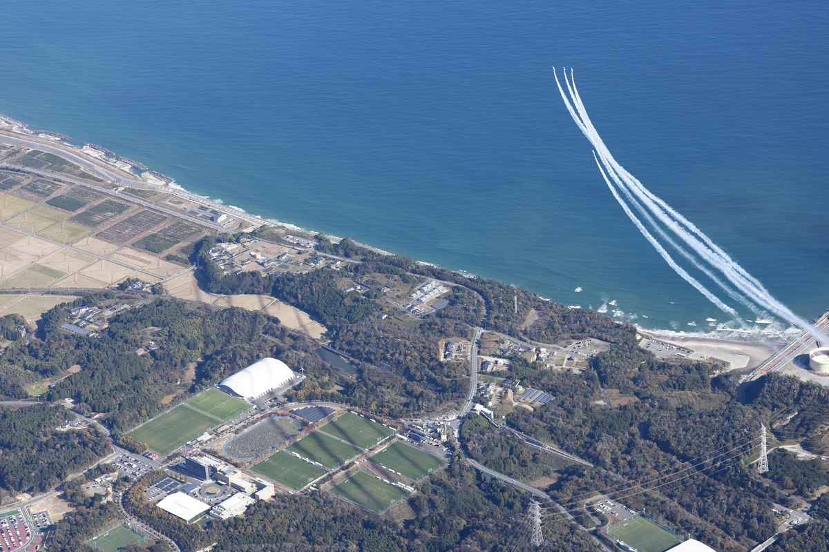Blue Impulse jets fly over J-Village in Fukushima Prefecture on Saturday.