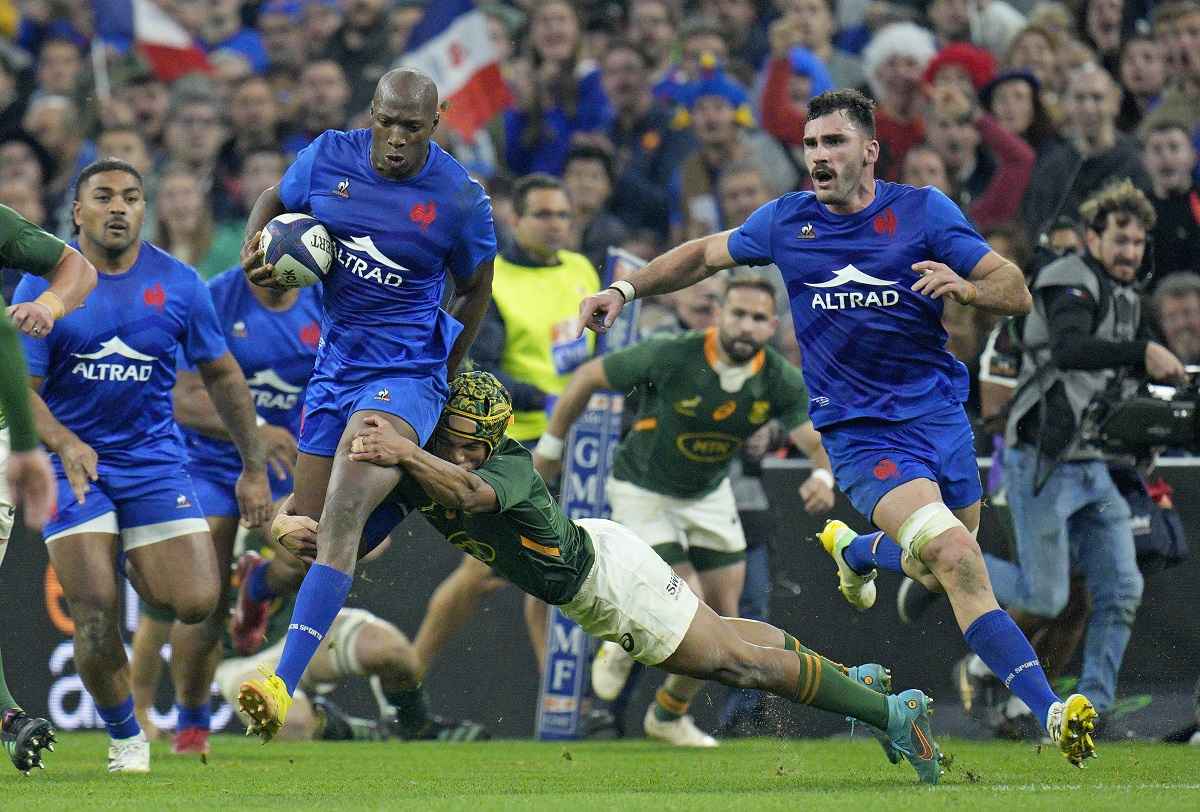 France’s Sekou Macalou is tackled by South Africa’s Kurt-Lee Ardense during the rugby union international between France and South Africa in Marseille, France, Saturday, Nov. 12, 2022.