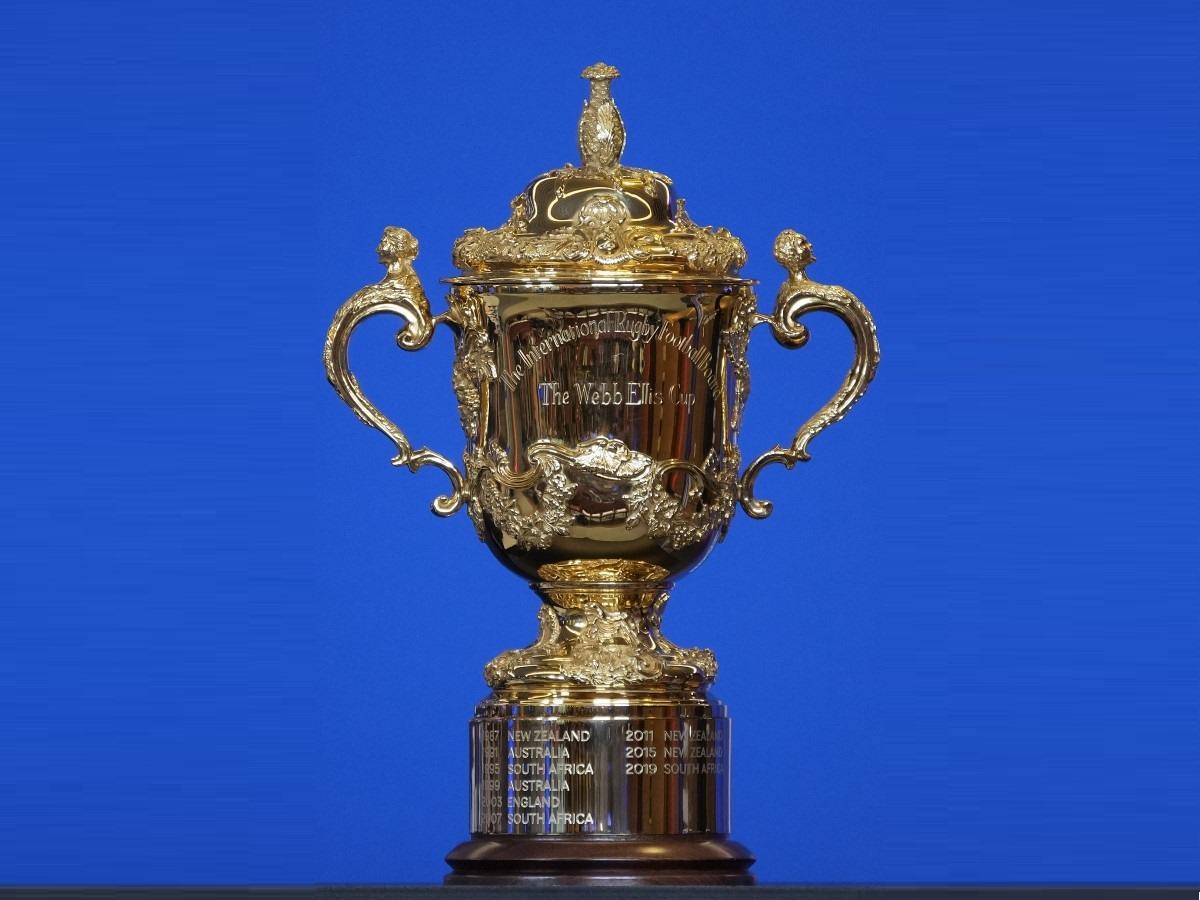 The Webb Ellis Cup is on display during a press conference in Paris, Monday, Sept. 4, 2023, ahead of the France 2023 Rugby World Cup.