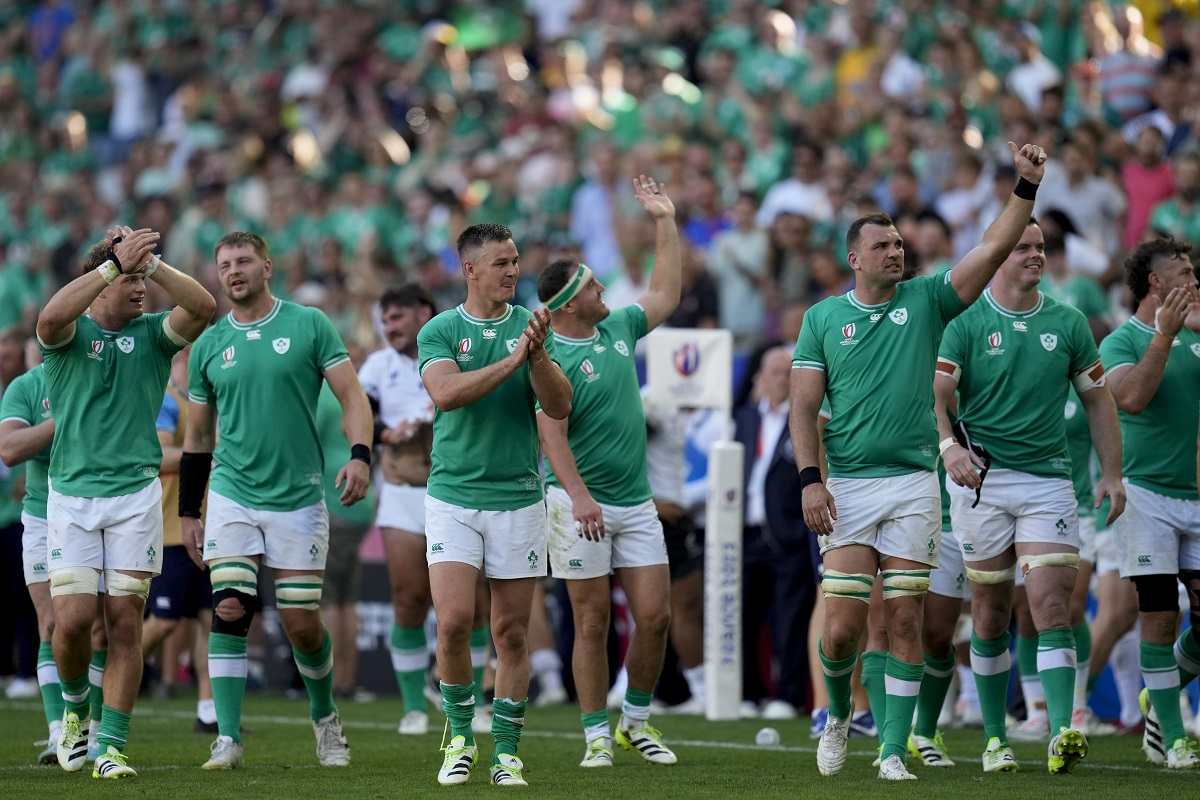 Ireland’s players celebrate at the end of the Rugby World Cup Pool B match between Ireland and Romania at the Stade de Bordeaux in Bordeaux, France, Saturday, Sept. 9, 2023.