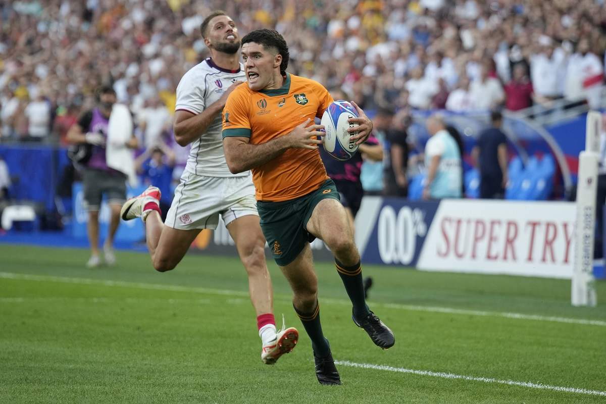 Australia’s Ben Donaldson runs to score during the Rugby World Cup Pool C match between Australia and Georgia at the Stade de France in Saint-Denis, north of Paris, Saturday, Sept. 9, 2023.