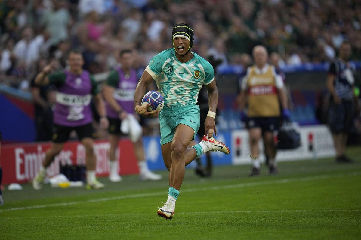 South Africa’s Kurt-Lee Arendse runs to scores a try during the Rugby World Cup Pool B match between South Africa and Scotland at the Stade de Marseille in Marseille, France, Sunday, Sept. 10, 2023.