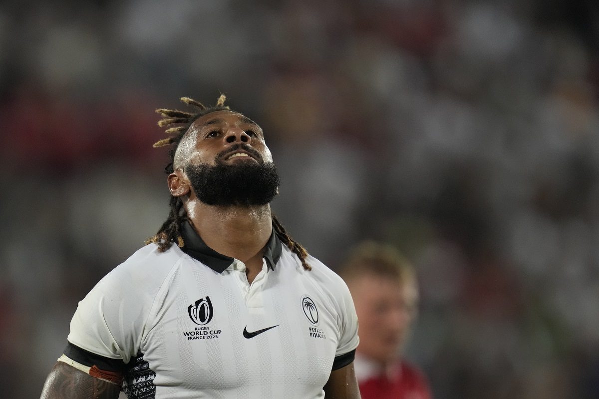 Fiji’s Waisea Nayacalevu reacts at the end of the Rugby World Cup Pool C match between Wales and Fiji at the Stade de Bordeaux in Bordeaux, France, Sunday, Sept. 10, 2023.