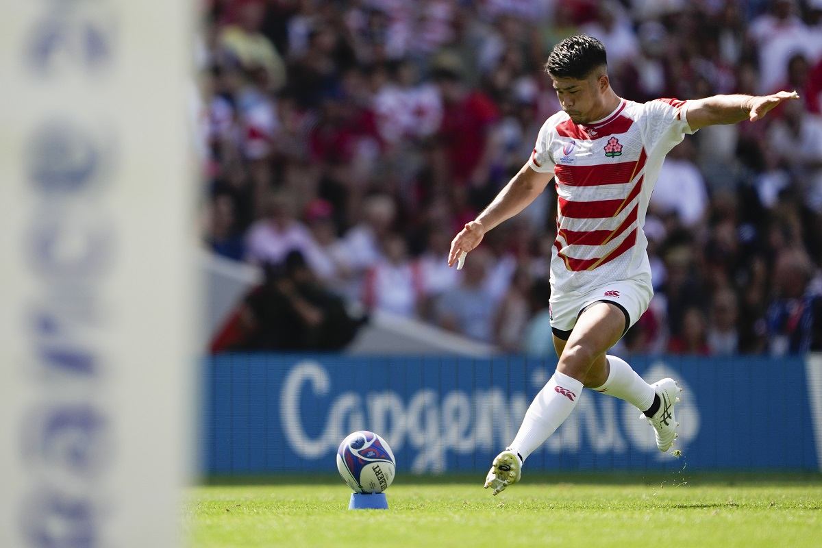 Japan’s Rikiya Matsuda kicks a conversion during the Rugby World Cup Pool D match between Japan and Chile at Stadium de Toulouse, Toulouse, France, Sunday, Sept. 10, 2023.